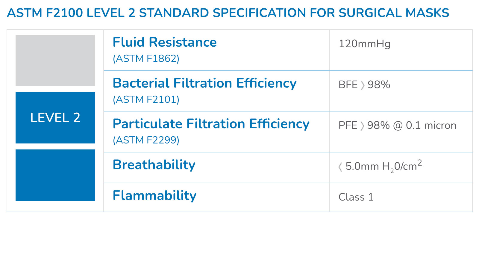 ASTM International is a standards organization that sets the best practices and international standard for global industries, including testing and requirements for performance of materials in healthcare. At ASTM Level 2, the AIR+ Surgical Mask is rated for medical use and protection against light to moderate exposure to aerosols, spray and fluids.