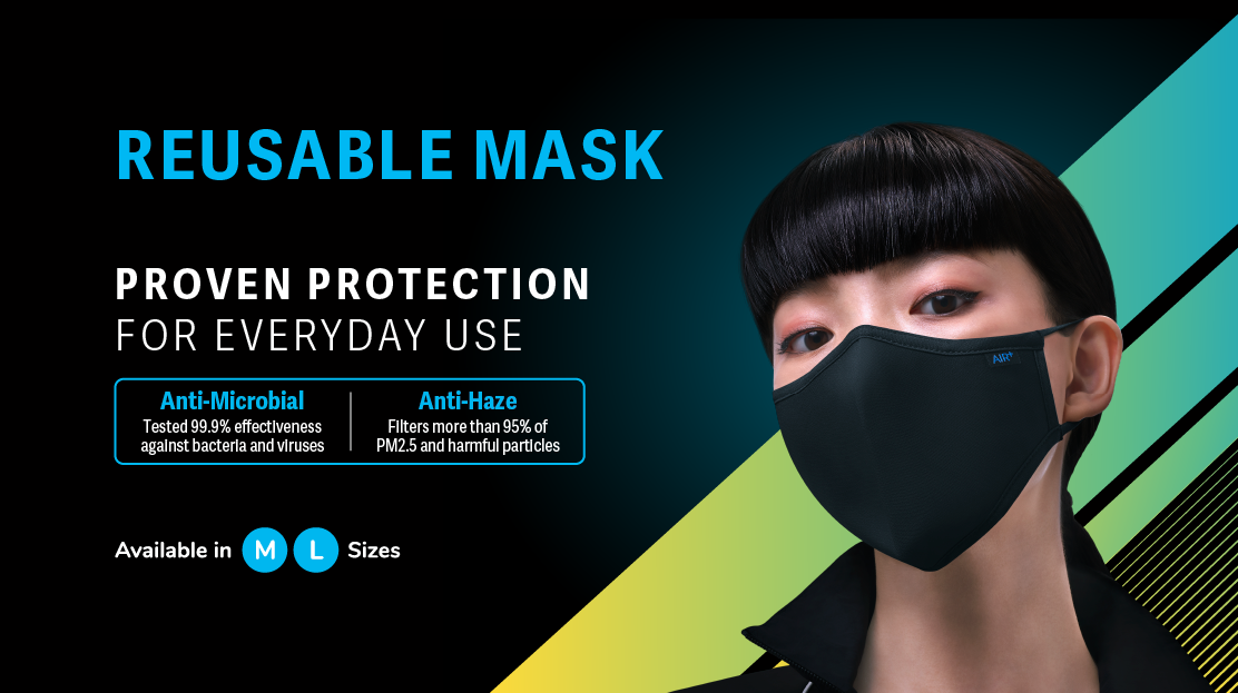 The first reusable mask launched under AIR+, ST Engineering’s award-winning mask brand for innovative respiratory protection, the AIR+ Reusable Mask is tested by Nelson Labs according to STP0014 Rev 09 protocol and effectively filters more than 95%[1] of particulates, including PM2.5 particles, haze, viruses and bacteria. Its anti-microbial coating is proven to kill 99.9%[2] of the SARS-CoV-2 virus[3] and harmful bacteria for up to 30 washes as tested to ASTM E2149-13a and ISO 21702:2019 standards, and dermatologically tested[4] to be safe and non-irritating to skin.
